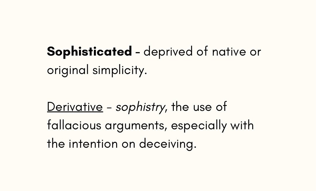 Sophisticated; deprived of native or original simplicity. Derivative; sophistry, the use of fallacious arguments, especially with the intention on deceiving. Also, deceptive reasoning or argumentation.